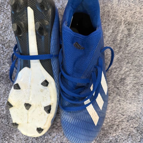 Adidas jalkapallokengät nappulapohjalla. Kengät ovat sinisen ja oranssin väriset. Koko on EU 38,5 (UK 5,5 / US 6) ja ne on merkitty miehille. Pohjassa on useita kiinteitä nappuloita, jotka soveltuvat luonnonnurmelle tai vastaaville alustoille. Valmistusmaa Indonesia. Sopivat jalkapallon pelaamiseen ja harjoitteluun.