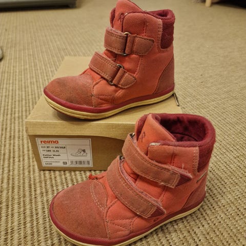 Reima Patter lasten kengät, koko 27, unisex-malli. Punertavat/liilat varrelliset kengät kevääseen ja syksyyn. Helpot laittaa lapsen itse jalkaan. Tarrat ehjät, ylemmät tarrat tarrautuvat vähän huonommin kuin alemmat mutta pysyvät vielä hyvin kiinni. Pohjallinen irrotettava. Kunto erittäin hyvä. Lapsen lempikengät juuri niiden helppouden takia. Reimatec-pinta pitää vettä teknisen kengän verran. Nämä olleet meillä monessa eri koossa, koska ovat olleet luottokengät välikauteen. Sisämitasta kuva.