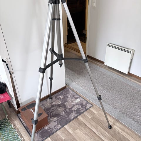Kamera jalusta, jossa alumiiniset teleskooppijalat ja vihreät muoviset säätöosat. Jalusta on korkeussäädettävä ja siinä on kallistettava ja käännettävä pää, jota ohjataan pitkällä vivulla. Sopii kameralle jossa on yhteensopiva kierrekiinnitys.