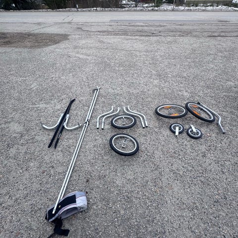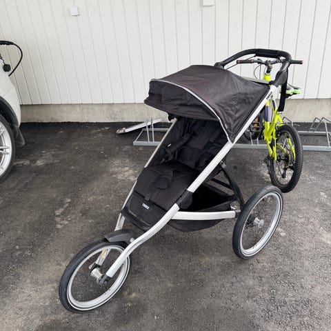 Thulen juoksurattaat kahdelle lapselle. Varusteena polkupyörällä ja hiihtämällä vetämiseen tarkoitetut varusteet (vetoaisa, sukset pyörien tilalle jne). Ehjät mutta pölyttyneet varastoinnissa.
