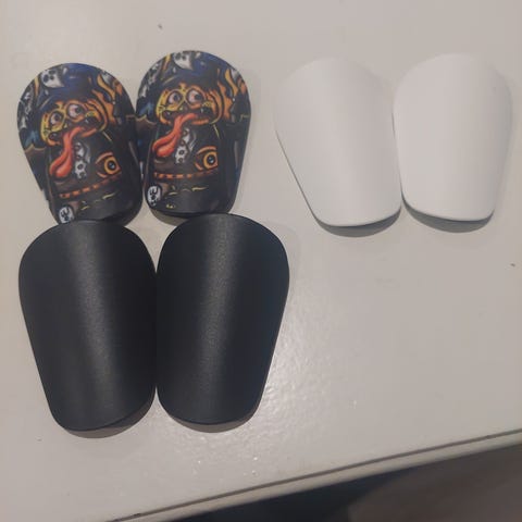 Mitre säärisuojat jalkapalloon. Kovamuovinen etuosa, jossa musta ja punainen kuviointi, sekä pehmustettu valkoinen sisäpuoli. Säärisuojissa on joustavat tarranauhat ja erilliset mustat nilkkasuojat. Soveltuvat jalkapallon pelaamiseen ja harjoitteluun. Kokomerkintää ei löydy, mutta lasten kokoa