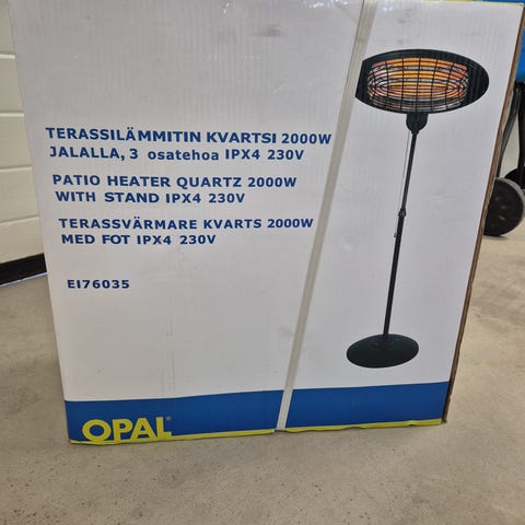 Opal AMT25 terassilämmitin jalustalla, teho 2000 W. Quartz-lämmitin, joka toimii 220–240 V jännitteellä ja 50/60 Hz taajuudella. Laitteen suojausluokka IPX4. Sopii esimerkiksi terassin tai parvekkeen lämmitykseen. Säädettävä jalusta mahdollistaa lämmittimen korkeuden ja kulman säätämisen käyttötarpeen mukaan.