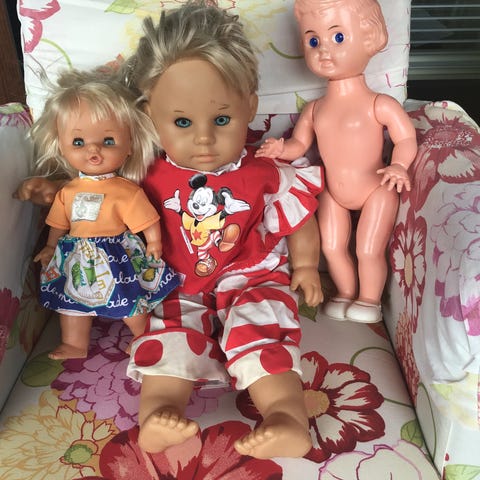Suloiset pienet tyttönuket 2 kpl + koira. Isot rusetit päässä, liikkuvat jäsenet ja pää. Erittäin hyväkuntoisia.