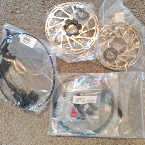 Letkujen pituudet 850mm/1700mm. Etujarru valmis ajoon, takajarruletku on irti kahvasta eli valmiina rungon sisäistä vientiä varten. Kahvaan liittämistarvikkeet tulee mukaan. Mukaan tulee myös yksi 20mm jarruadapteri (+pidemmät kiinnitysruuvit), jolla saa esim. 160mm levyn sijaan käyttöön 180mm levyn tai 180mm sijaan 200mm.