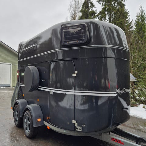 Näyttävä kokomusta traileri monipuolisilla tiloilla ja satulakaapilla. ❗️ 𝐊𝐨𝐤𝐨𝐧𝐚𝐢𝐬𝐦𝐚𝐬𝐬𝐚 𝟏𝟒𝟎𝟎 𝐤𝐠 (madallettu), joten kantavuutta yhdelle hevoselle tai kahdelle ponille. Pitkät puomit valmiina! Väliseinä myös mukaan, mikäli haluaa kuljettaa poneja.