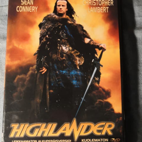 Highlander elokuva DVD. Pakkaus sisältää kokoillan toiminta-fantasiaelokuvan DVD-levyllä kotelossa. Kansi- ja takakuvissa elokuvan kuvitus ja perustiedot, kuten näyttelijät ja lyhyt kuvaus elokuvan sisällöstä. Sopii katsottavaksi DVD-soittimella tai muulla yhteensopivalla laitteella.