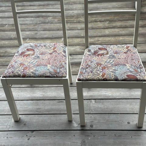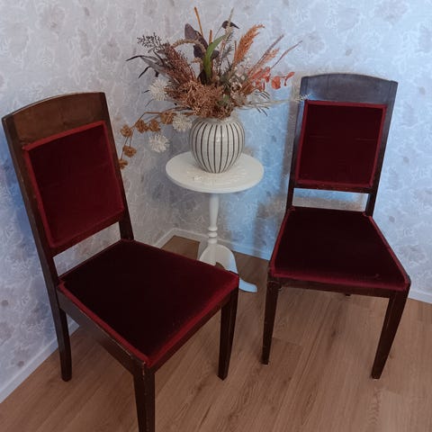 2 erilaista, mutta saman tyylistä vanhaa tuolia. Tukevat ja hyvät istua.