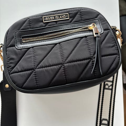 River Island sydämenmuotoinen musta olkalaukku. Keinonahkaa. Laukun etuosassa koristeniitit. Olkahihna on irrotettavissa. Laukussa on myös käsikahva. Laukku on uusi, käyttämättä jäänyt.