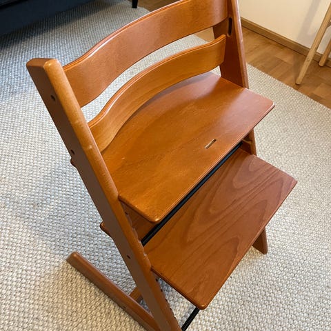 Tästä täydellinen paketti uuteen kotiin. Stokke syöttötuoli, puinen runko. Joitain kulumisen jälkiä. Tuolissa on säädettävä istuin- ja jalkaosa. Mukana tulee irrotettava etukaari turvavyöllä (2kpl) sekä pehmusteita, jotka näkyvät kuvissa. Punaiset ovat Stokken, vaalea Emma-merkkinen. Vain nouto.