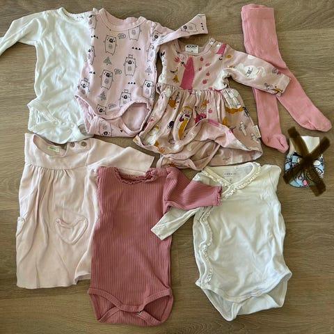 Hyväkuntoisia. Sisältää merkkituotteitakin, mukavia asukokonaisuuksia. 12 bodya, 6 housut, 2 yöpukua, 1 pusero, 4 lakkia, 2 sukat