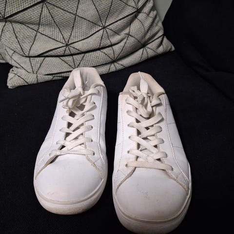 H&M tytöille suunnitellut lenkkarit, koko 35. Väri valkoinen. Päällinen synteettistä materiaalia ja tekstiiliä, nauhakiinnitys. Vuori ja sisäosa tekstiiliä, kumipohja. Sopivat arkeen ja vapaa-aikaan esimerkiksi koulu- ja ulkoilukengiksi kuivemmille keleille.
