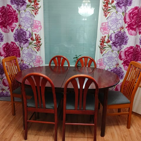 Pieniä käytönjälkiä näkyy pöydässä, niistä kuvia. Tuolit taas ovat lähes uudenveroisessa kunnossa.