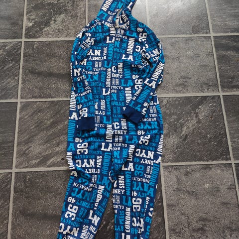 Lasten pyjama, koko 146/152cm. Settiin kuuluu pitkähihainen paita (H&M) ja (Abercrombie) pitkät housut. Materiaali on puuvillaa. Mielestäni vastaa aika hyvin kokoa. Olo meillä käytössä vielä koossa 152/158cm.