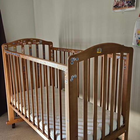 Pinnasängyn reunapehmuste, sopii 120x60cm pinnasänkyyn. Yksi naru puuttuu mutta pysyy hyvin siitä huolimatta.