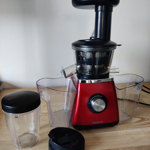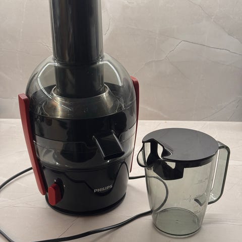 Panasonic mehustin kotikäyttöön. Laitteessa on valkoinen runko ja läpinäkyvä säiliöosa. Mukana erillinen mehukannu ja osat hedelmien ja vihannesten syöttöä varten. Mehustin toimii verkkovirralla ja siinä on pyöritettävä käyttökytkin. Soveltuu hedelmien ja vihannesten mehustamiseen keittiössä. Kaapeli ja pistotulppa näkyvät kuvissa, samoin irrotettavat osat puhdistusta varten.