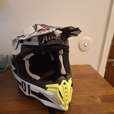Airoh offroad-kypärä musta vihreä Täyskypärämallinen offroad-/cross-kypärä, jossa pitkä lippa ja laaja leukasuoja. Kypärässä on musta pohjaväri vihreillä ja harmailla graafisilla kuvioilla. Sisäosat ovat pehmustetut ja hengittävät, leukahihnassa pikasolki. Kypärän mukana näkyy käytettävän keltaoransseilla linsseillä varustettuja ajolaseja. Soveltuu moottoripyörä- tai motocross-käyttöön. Koko ja tarkempi mallimerkintä eivät käy ilmi kuvista.