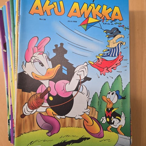 1970-1990 -luvuilta erilaisia Aku Ankka-kirjoja sekä Roope-sedän Aarrearkku -kirjoja.