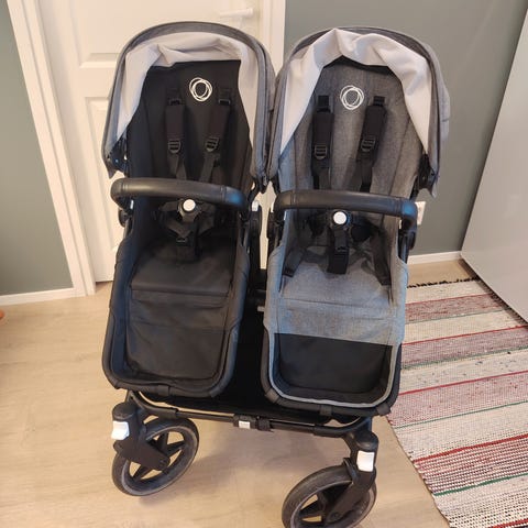 Kuvien mukaiset Bugaboo tuplarattaat kahdelle lapselle. Rattaissa on vierekkäin sijoitetut istuimet, joissa erilliset turvakaaret ja säädettävät selkänojat. Sisältää Lisäksi vauvan vaunukopan ja rattaisiin kiinnitettävän varuste kassin. Rattaissa on tavarakori rungon alla. Rattaat säilytetty lämpimässä varastossa.