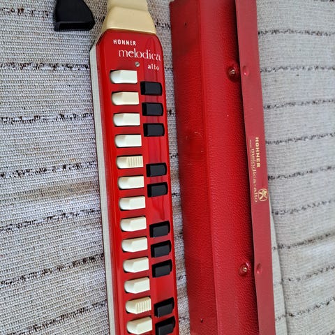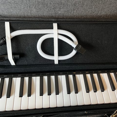 Suzuki melodihorn M-36 kotelolla. Soittimessa on pianokoskettimet ja se soitetaan puhaltamalla mukana tulevan letkun ja suukappaleen kautta. Kova kotelo suojaa soitinta säilytyksen ja kuljetuksen aikana. Sopii esimerkiksi musiikin harrastamiseen ja harjoitteluun.