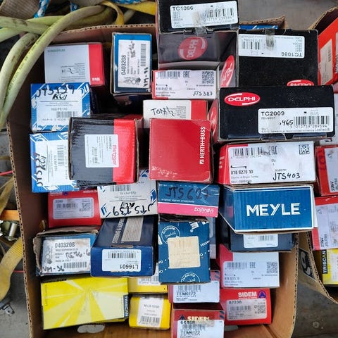 Uusia varaosia paljon laatikoissaan. Alla listaa mihin sopii.