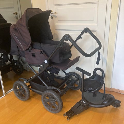 Todella siistissä kunnossa olevat tukevat ja näppärät Ora (Hertta) rattaat, jossa kääntyvät etupyörät. Menee hyvin kasaan. Sadesuojan saa mukaan.