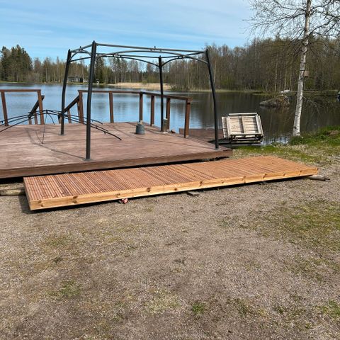 Puu-elementtien hinta 95 e/kpl + rst-kannatusjärjestelmä: 80 e/tolppa lisukkeineen + säätämisessä käytettävä laite 100 e + laituriköysi: läpimitta 30 mm, pituus n. 30 m, hintaan 60 e. - Siis, jos koko paketti lähtee, niin hinta on 10x95 e + 18x80 e + 100 e = 2490 e/ tarjous. Kuljetus käyttöpaikalle onnistunee uittamalla koko paketti välillä Murole - Virrat -Mänttä-Vilppula. Jos lähtee muuhun vesistöön, tässä on n. 1 km päässä veneenlaskuluiska, josta kuorman voisi lastata esim. auton kuljetuksessa käytettävään perävaunuun, ja täältä kotirannasta uittaa se luiskalle.