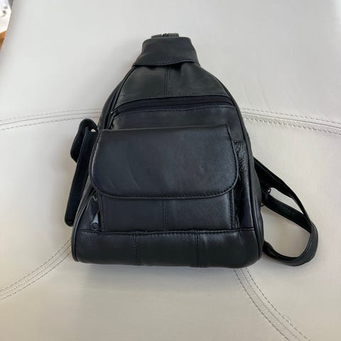 Pieni ruskea nahkareppu, erittäin mukava kävelyille, hinta 35 euroa.