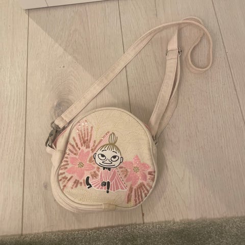 Moomin kangaslaukku naisille. Pieni olka- tai käsilaukku, jossa mustavalkoinen Muumi-kuosi. Laukussa metallinen kehys ja suljin sekä pitkä hihna, jota voi käyttää olalla tai olan yli. Materiaalina kangas, yksityiskohdissa metalliosia. Sopii esimerkiksi pienten tavaroiden, kuten puhelimen, avainten ja lompakon kuljettamiseen.