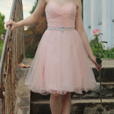Haloselta ostettu juhlamekko, koko 32, xs/xxs. Ollut meillä rippimekkona. Tyttö 160 cm pitkä ja käytti silloin 34 koon vaatteita.