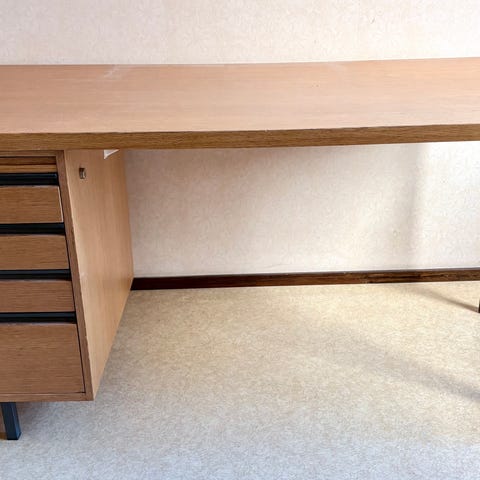 Suorakulmainen toimistopöytä, jossa puunvärinen pöytätaso ja mustat jalat. Sopii työpöydäksi toimistoon, kotitoimistoon tai opiskelutilaan. Pöydän pinta on tasainen ja helppo pitää puhtaana, ja mustat jalat tuovat rakenteelle tukevuutta. Pöytä soveltuu esimerkiksi tietokoneelle, näppäimistölle ja muille työvälineille.
