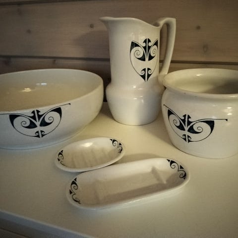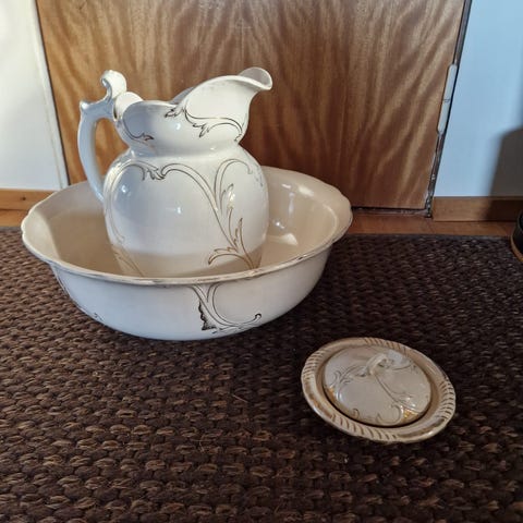 Arabia Pesukalusto 5-osaa. Kannu, vati, potta ja saippuakupit. Potan ja kannun viat kuvissa. Ylihärmässä.