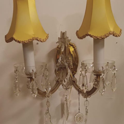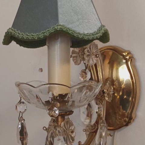 Maria Teresia seinävalaisin, kangasvarjostin, kristallit kaikki, sähköt ok.