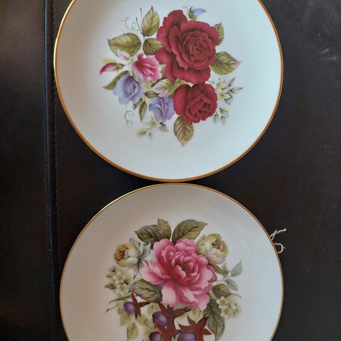Kukkakuvioidut posliinilautaset, useita eri malleja ja värejä. Lautasissa on erilaisia maalattuja kukka-aiheita sekä pyöreitä ja pitsireunaisia muotoja. Kaikissa seinä kiinnitys. Myydään yhdessä.