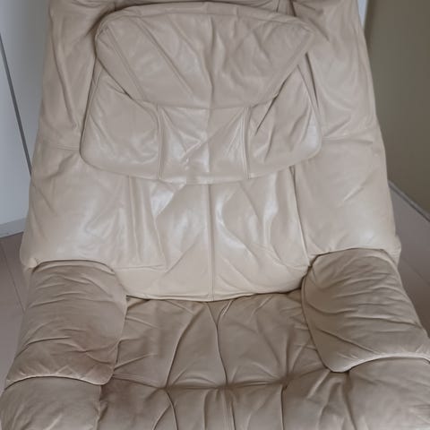 Myydään hyväkuntoinen Ekornes Stressless nahkatuoli rahilla, rahin mitat 40 x 50 x 40 cm (k x l x s).