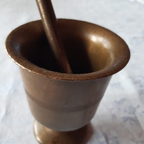 Messinkinen, vanha mortteli, kork. 8cm