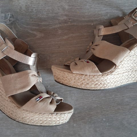 Tommy Hilfiger kiilakorkosandaalit, koko 37. Sandaaleissa on musta kangaspäällinen, ruskeat nilkkaremmit ja rusettikoriste edessä. Pohja on punottua kiilakorkoa, ulkopohja kumia. Sopivat esimerkiksi kesäkäyttöön ja siistimpään arki- tai juhlapukeutumiseen.