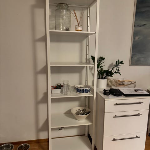 Moderni Ikea FJÄLKINGE hyllykkö. Valkoinen metallirunko ja seitsemän hyllytasoa, joista 5 siirreltävissä, tarjoavat runsaasti säilytystilaa. Sopii hyvin minimalistiseen sisustukseen ja on käytännöllinen valinta moneen tilaan.