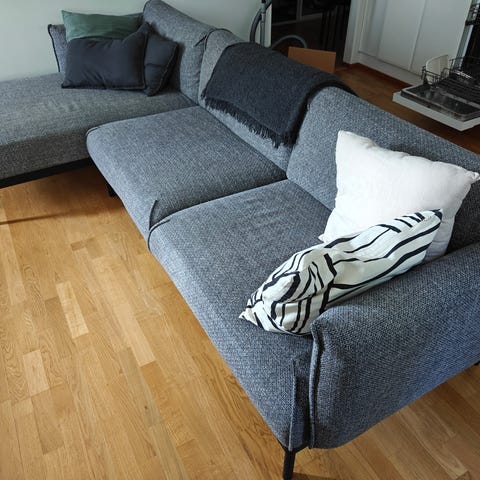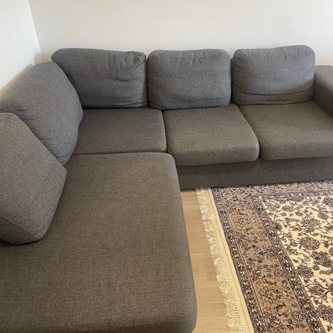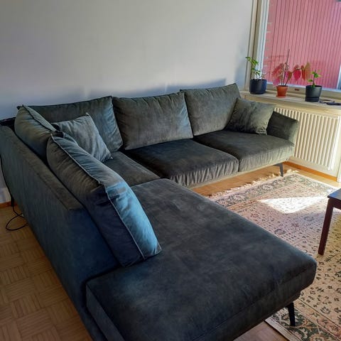 Myydään (tai vaihdetaan hieman pienempään harmaa / vihreä / sinertäväsävyiseen sohvaan) Ikean laadukas, helppohoitoinen ja mukana kulmasohva.
