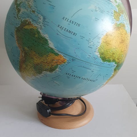 Pieni karttapallo valoilla. Korkeus 27 cm ja leveys 18 cm. Johto on n. 1,8 m pitkä.