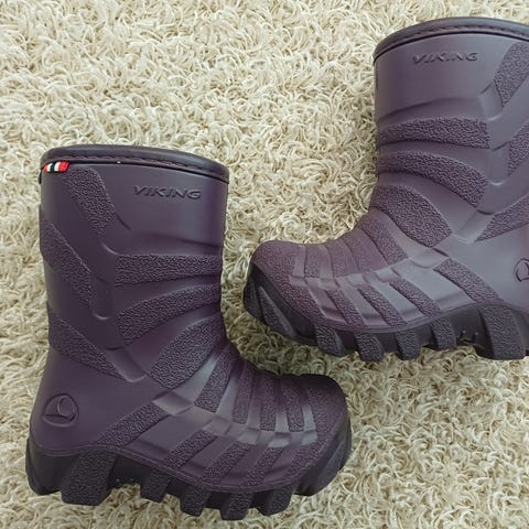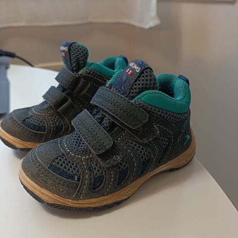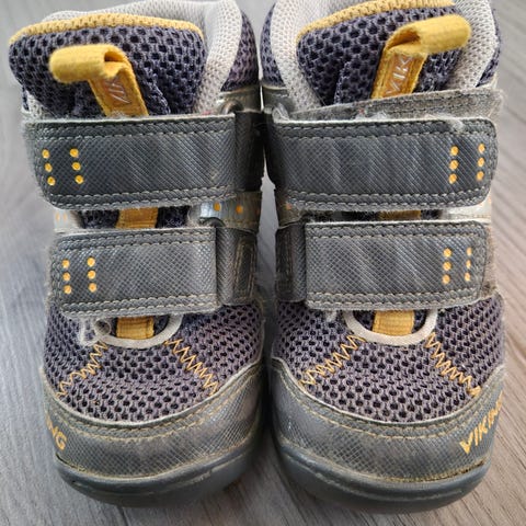 - Siniset Viking goterex-kengät, koko 22. Kärjissä heijastinkankaan kuluma näkyy kuvissa paljon selvemmin kuin luonnossa, muuten en huomannut kulumaa. Tarrat pitää hyvin.