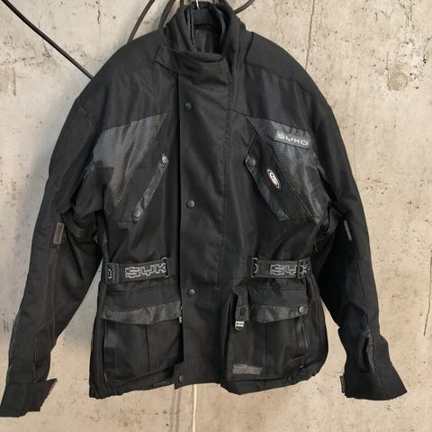 BSS Snowmobile ajotakki. Takissa on monivärinen musta–valkoinen–punainen kuosi ja suuret BSS- ja SX-logopainatukset hihoissa ja selässä. Sisäpuolella on tikattu vuori. Takki on suunniteltu moottorikelkkailuun ja muuhun talviajoon. Koko ja materiaali eivät käy ilmi kuvista.