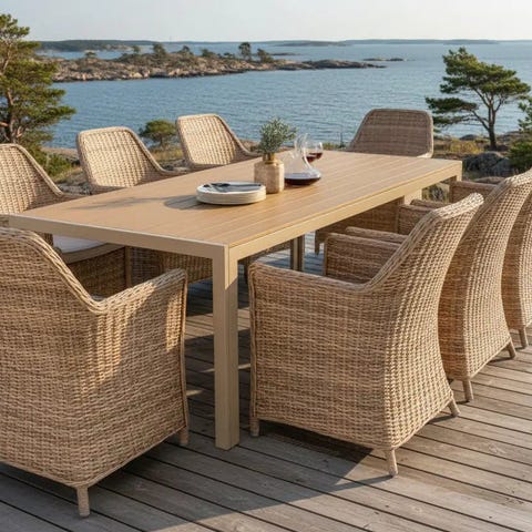 – Tilava 9‑osainen ulkokalustesetti: pöytä + 8 tuolia