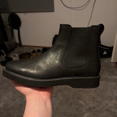 Vagabond Cosmo 2.0 saappaat, koko 42. Mustat nilkkapituiset saappaat, joissa paksu kumipohja ja selkeä kuviointi. Päällinen nahkaa, sisäpuolella synteettinen vuori, vetoketjut sisäsyrjällä. Ostettu Stockmannilta viime syksynä, mutta omat hankalat jalat eivät tykkää. Hyvin vähällä käytöllä olleet siis.
