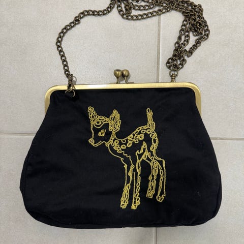 Suomalaisen design-brändi Ivana Helsingin pinkki Bambi-laukku. Laukku on Paola Suhosen suunnittelema, ja siinä on merkille tyypillinen kullanvärinen Bambi-brodeeraus, "napsulukko" meripihkan värisillä palloilla sekä pitkä kultainen ketjuhihna. Hihnan saa halutessaan pois. Laukun koko noin 10cm×20cm.