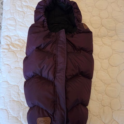 Voksi Move lämpöpussi vaunuihin tai turvakaukaloon. Ulkopinta tummanharmaa ja sisäpinta vaalea. Pussissa on aukot turvavöille, kiristettävä pääosa ja vetoketju edessä helpottamassa pukemista ja riisumista. Mukana tulee säilytyspussi.Ainut pieni moite viimeisessä kuvassa.