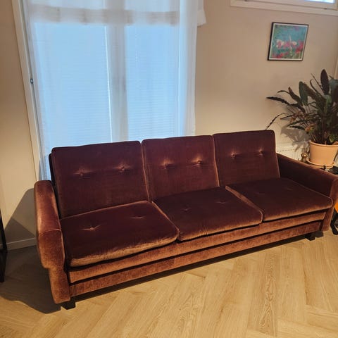 1970- tai 1980-luvun kolmen istuttava sohva. Oikein kevyt kantaa tai siirrellä. Mitat noin ja suunnilleen. On kulumaa ja käytön jälkiä sohvan takana/alla mutta istuinosa ja yleisilme ok.