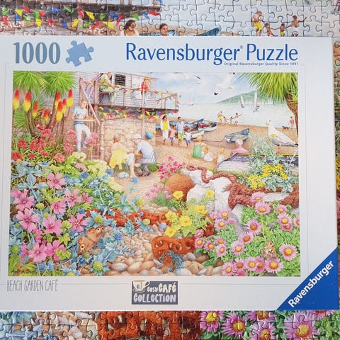 King Jungle Party palapeli 1000 palaa. Kuvassa on useita viidakon eläimiä, kuten norsu, flamingo, papukaija ja muita eläimiä trooppisessa ympäristössä. Sopii aikuisille ja vanhemmille lapsille, jotka pitävät eläinaiheisista palapeleistä ja suuremmista palamääristä.