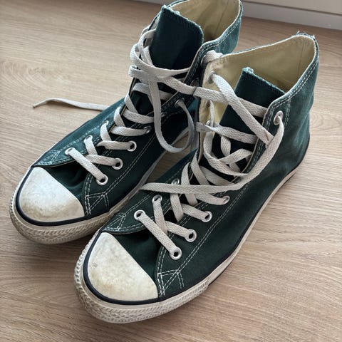 Converse All Star tennarit, koko 43. Korkeavartinen malli sinisestä kankaasta, valkoiset kumipohjat ja kärjet sekä valkoiset nauhat. Sopivat arkikäyttöön ja vapaa-aikaan.