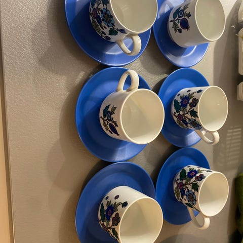 Sinivalkoinen posliiniset astiastosto, lautaset ja mukit kauniilla kukka-kuviolla. Klassinen tyyli, hyvä kunto.