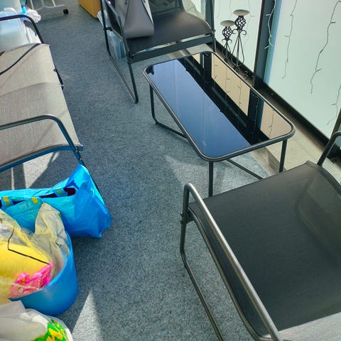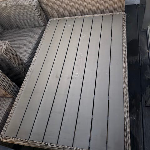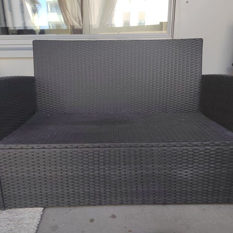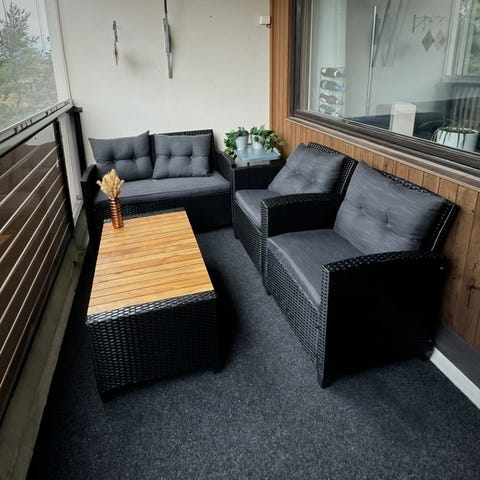 Jyskin puutarhakalusteryhmä, jossa kaksi nojatuolia, kahden istuttava sohva ja pieni sohvapöytä. Tuolit ja sohva on hyvässä kunnossa, jalkojen maalipinnassa pientä käytön jälkeä, muttei mitään erottuvaa. Sohvapöydän pinnassa maalissa kulumaa, sen saa mukaan kaupan päälle halutessaan. Materiaali kalusteissa on metalli ja muovi. Nouto Tillinmäestä